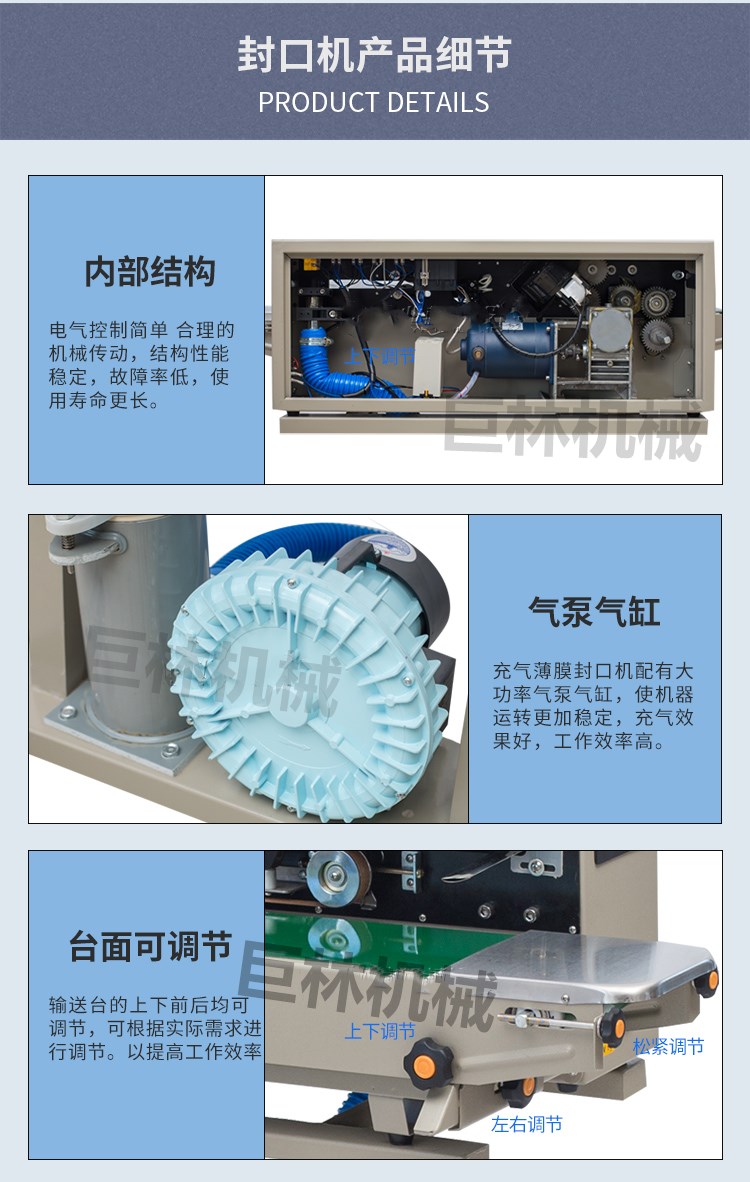 本机主要适用于膨化食品的包装,是在自动薄膜封口机改进自动充气装置后的产品,塑料薄膜经过充气包装后提高了抗碎性,减少食品在运输过程的损坏。
