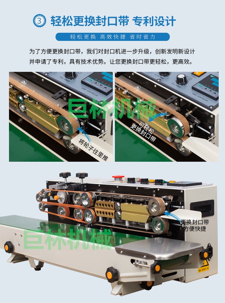 本机是新一代集印码,封口,连续输送为一体的自动薄膜封口机,具有印字清晰、顔色可选、即印即干、换字方便等特点。