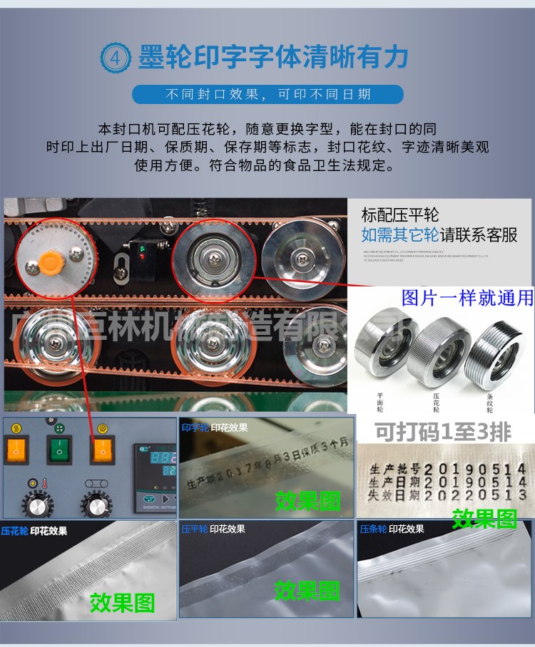 该机具有连续输送、封口、油墨印制标签(出厂日期、生产批号等)一次完成之功效,可封合印制任何一种可热性的薄膜。